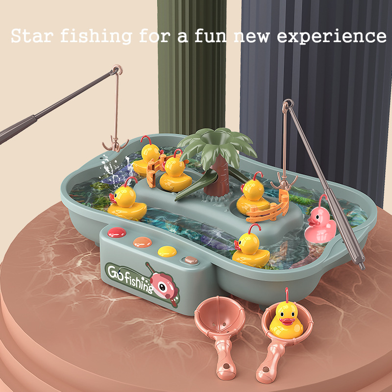 Câu cá là một trò chơi không còn xa lạ với nhiều người. Tuy nhiên, bộ đồ chơi bữa tiệc nhạc nước đã được nâng cấp với nhiều tính năng thú vị hơn. Bộ đồ chơi gồm một hồ nước, hai cây, hai cần câu và sáu chú vịt cùng với các phụ kiện khác. Khi lắp pin và đổ nước vào hồ, bật động cơ lên, nước sẽ chảy vòng quanh hồ, làm cho những chú vịt di chuyển liên tục, tăng độ khó và thú vị cho trò chơi. Trò chơi này không chỉ giúp bé rèn luyện tính khéo léo và kiên trì mà còn giúp phát triển kỹ năng vận động tinh và khả năng kết hợp giữa tay và mắt.